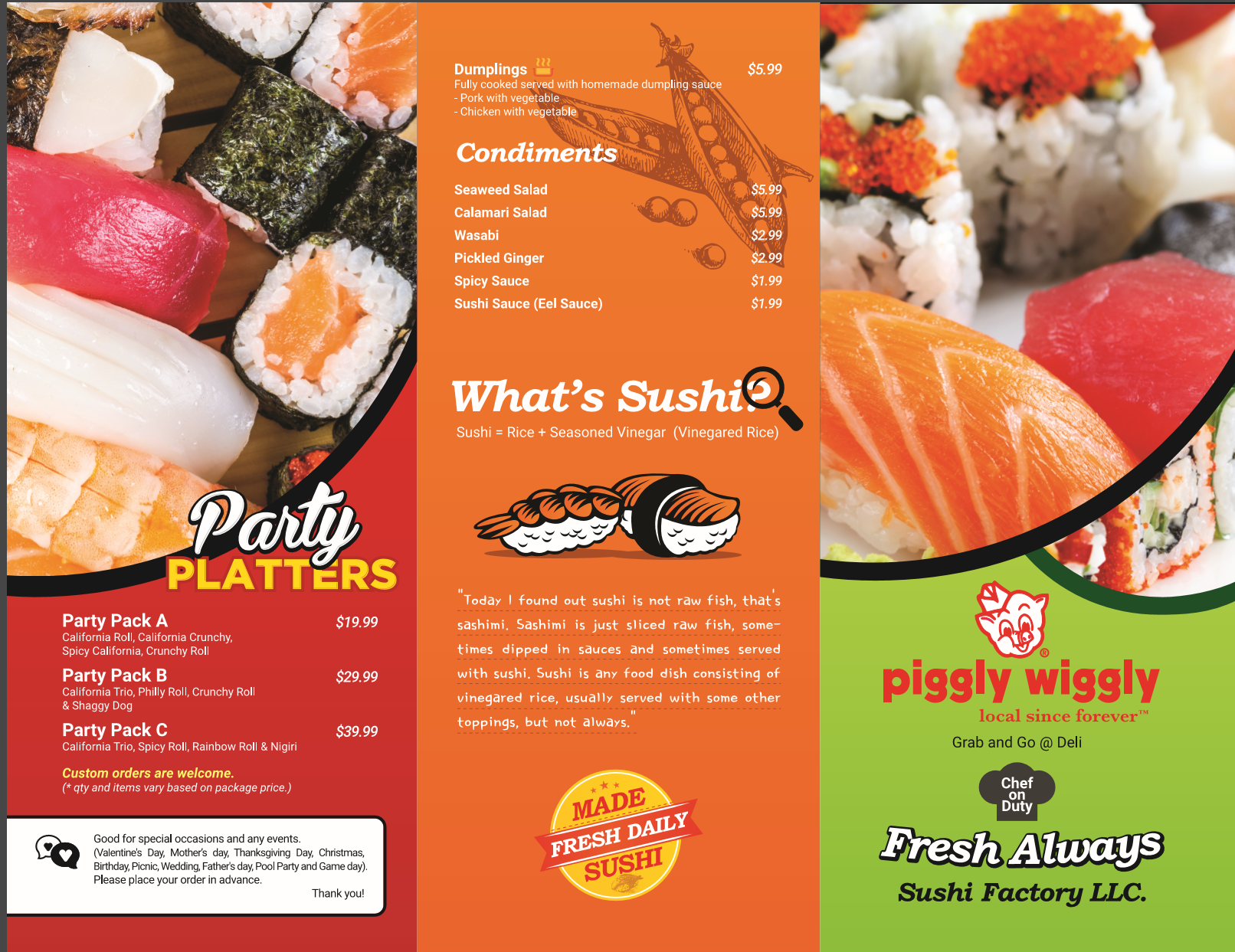 “For your everyday or special occasion meals, our Delis have it all. From fresh fried or rotisserie chickens to fresh entrees and soups. Boar’s Head Deli Sliced Meats and Cheeses available. Let us help make your Celebration a Success Order a Delicious Party Tray Today.”